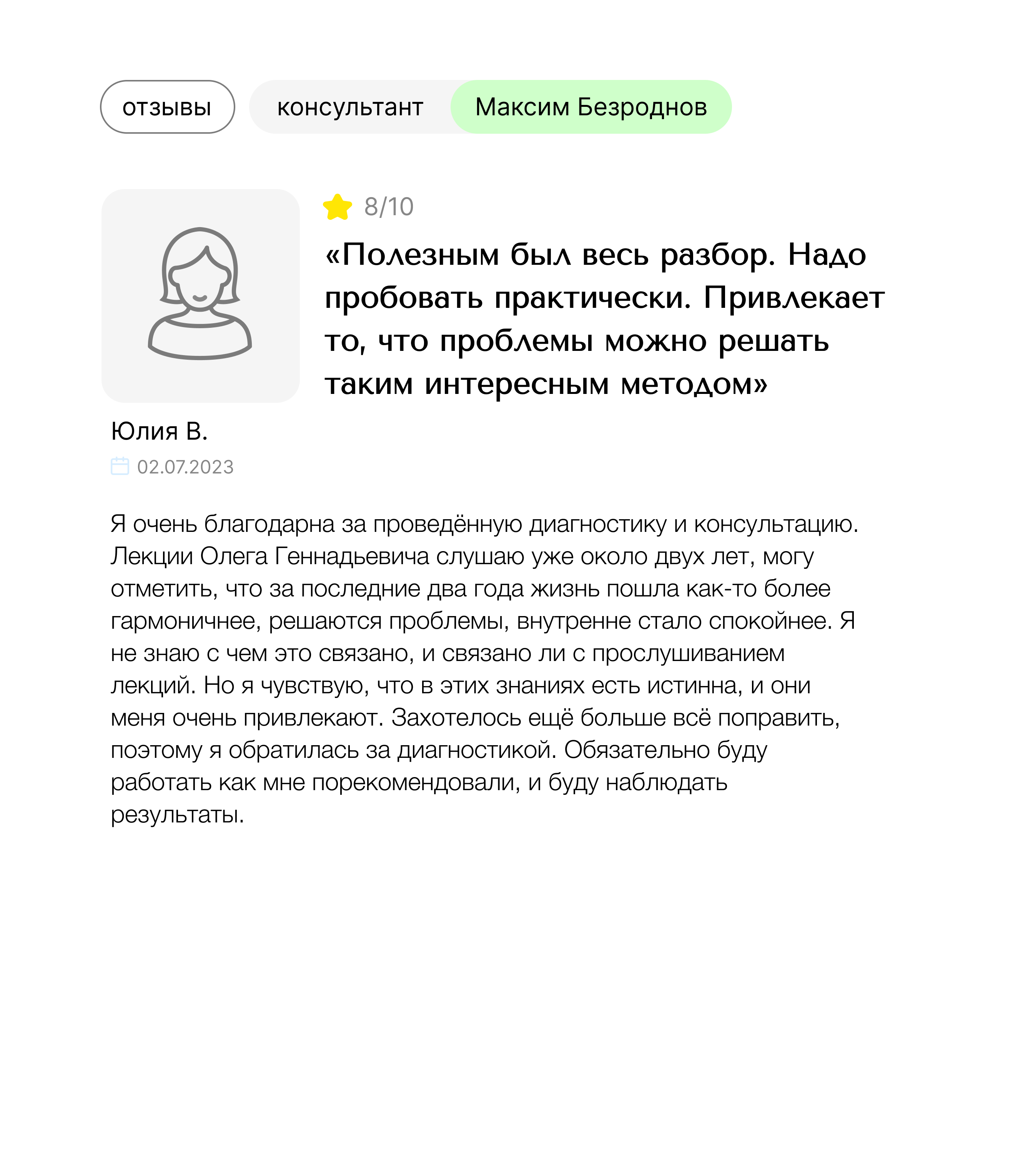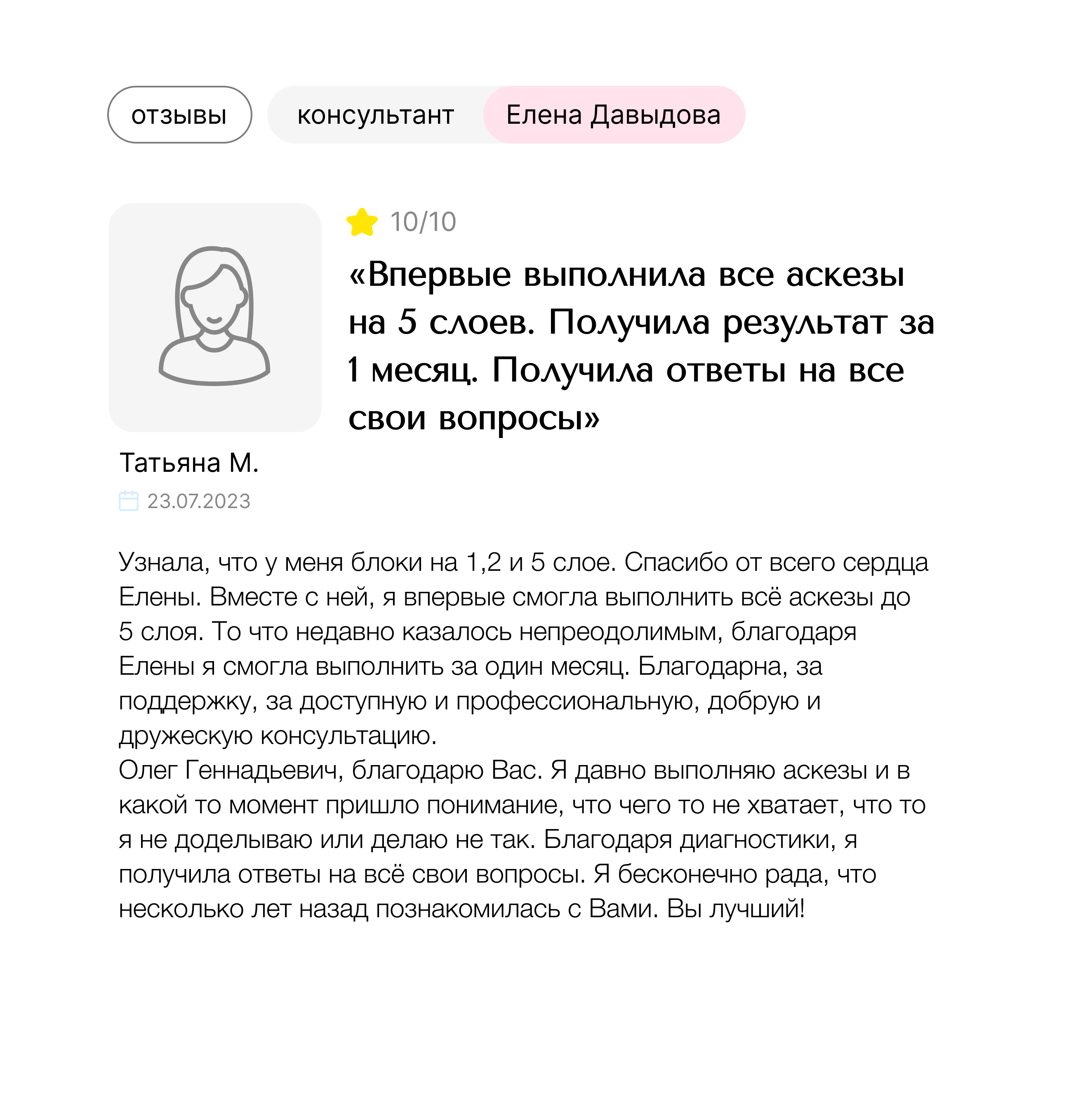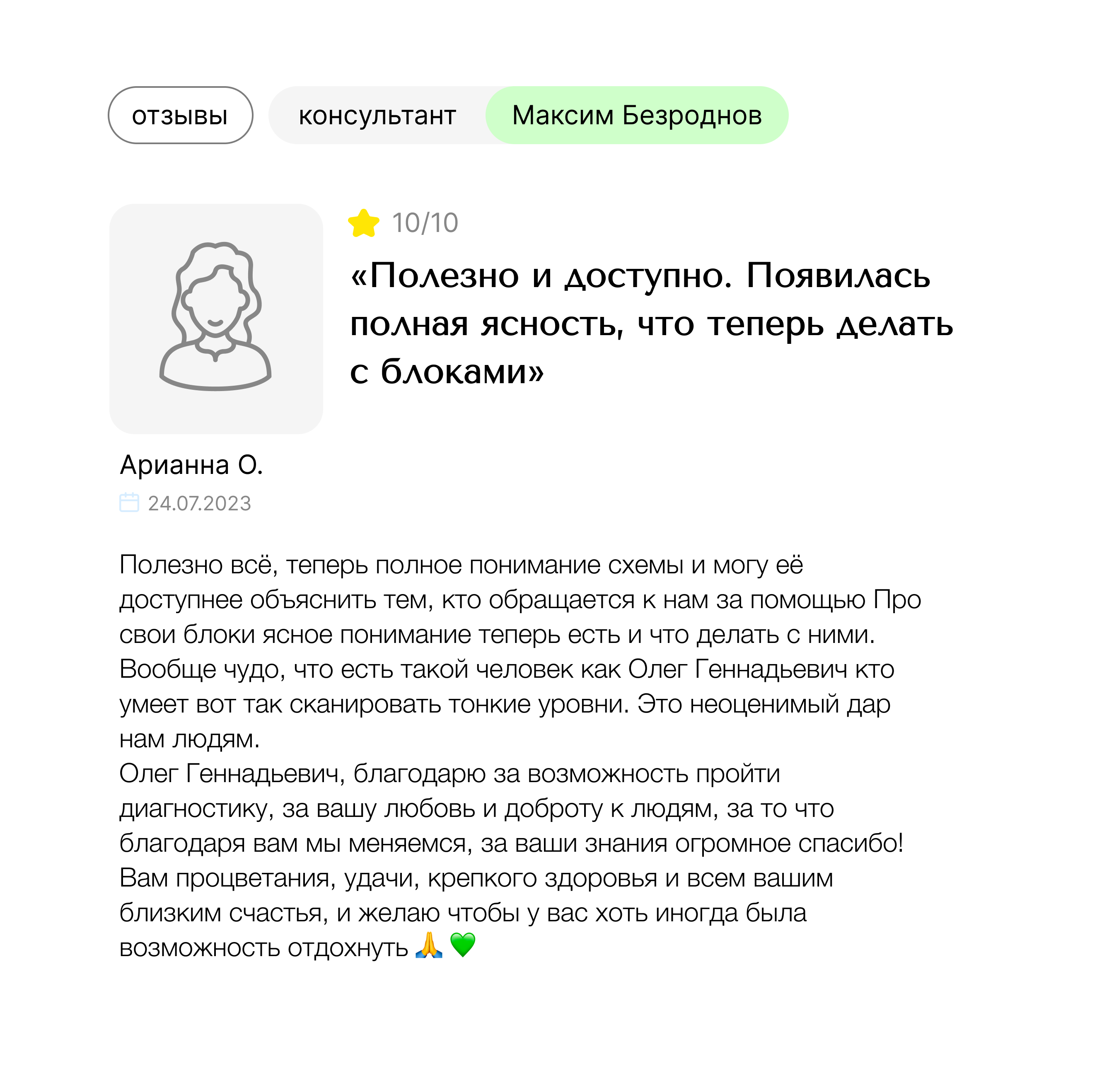 физического и психического. После диагностики вы будете точно знать, на каком психическом слое у вас блок, на какую сферу жизни он влияет и каким образом.
